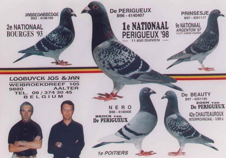 Welcome in this website of Loobuyck Jos and Jan. On the page 'history' you can find how Jos Loobuyck started with pigeons. By 'composition' you will find three different pages: - at first you can read something about 'the golden couple' - you can also find the 'new races' they bought. - and then you can see the results of the 'cross breeding' between the suns and daughters of the golden couple and some of the new races. If you want to know how the widowers are cared you should visit 'care and method'. By the 'results' you can find the three top results: - you can also see the 'results of the year 2001' - and the 'championships' of the last years. In the 'photo-album' you can see the best pigeons of this loft. We'll wish you a pleasant visit! |